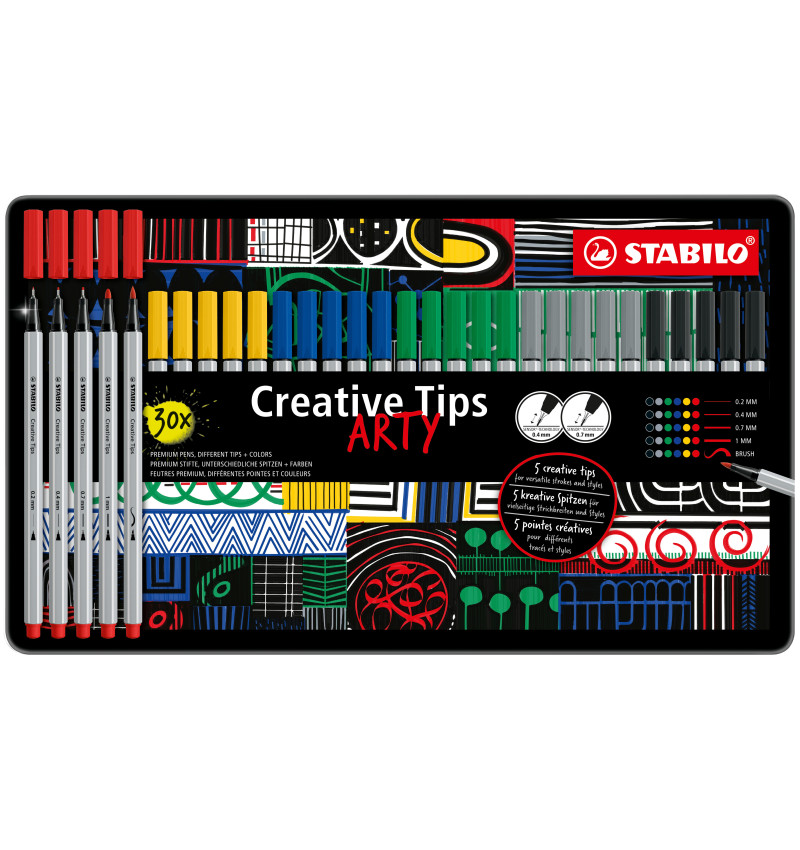 Set de Micropuntas y Marcadores, ARTY Creative Tips, Caja Met x 30 Unds. Puntas: 0.2 mm, 0.4 mm, 0.7mm, 1.0 mm, Pincel. 6 Distintos Colores.