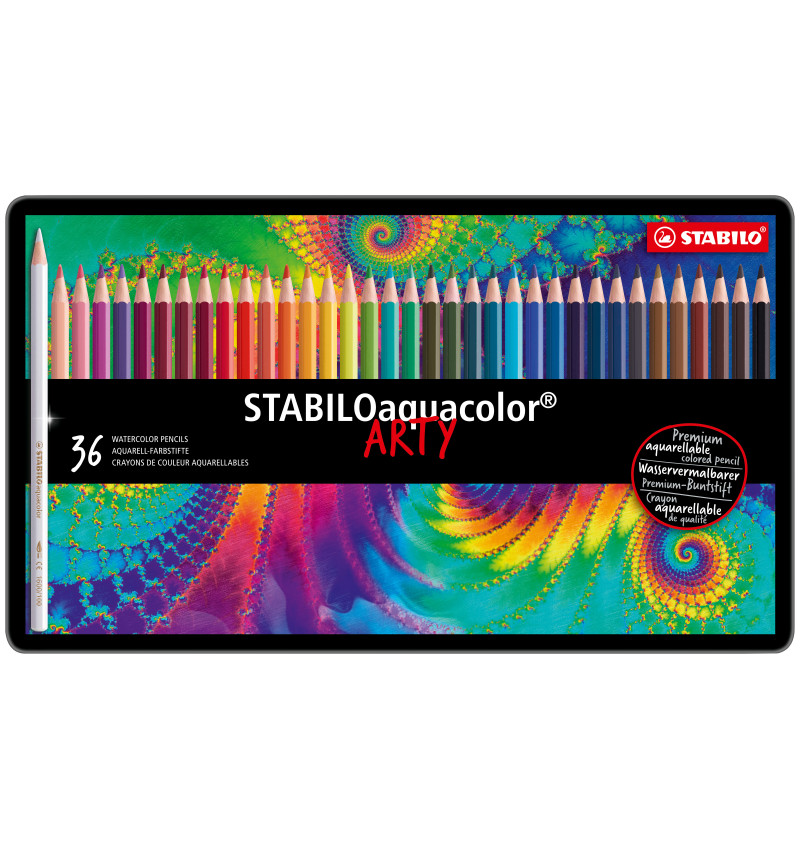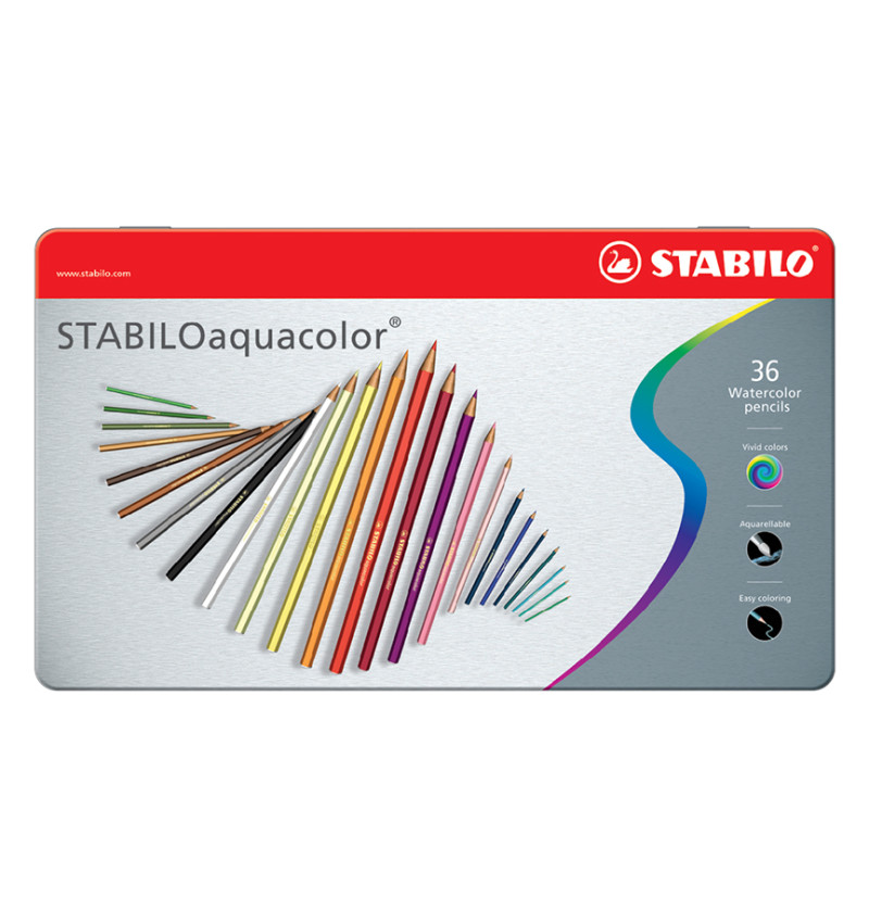 Lápices de Color Acuarelables, Largos, Aquacolor, Cuerpo Hexagonal, Mina 2.8 mm, Caja Metal x 36 Colores.